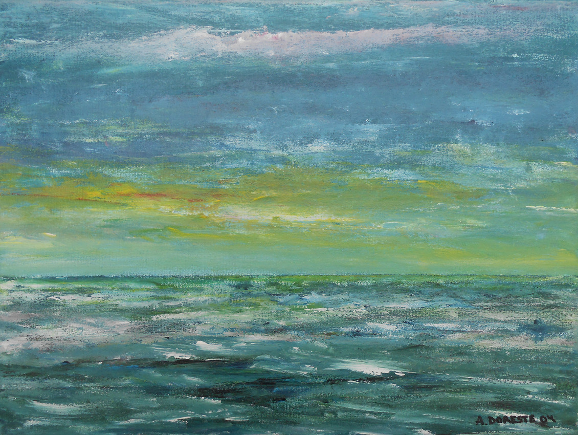 Este cuadro es una pintura de estilo impresionista que transmite calma y amplitud. La obra muestra un horizonte marino, con el cielo dominando la mayor parte de la composición. Los tonos predominantes son azules y verdes, con matices amarillos y anaranjados que sugieren el resplandor del sol al atardecer.