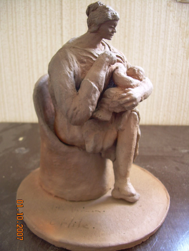 tipica mujer de pueblo amamantado a su hijo,obra en arcilla de Elita Rivera E.escultora de Antuco Chile