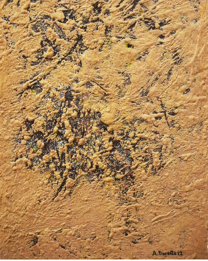 Este cuadro es una obra abstracta con una fuerte textura, dominada por tonos tierra, ocres y marrones que se superponen en una superficie irregular. Entre las capas se filtran sutiles destellos de azul, verde y rojo, que parecen emerger como fragmentos ocultos bajo la arena o la piedra.