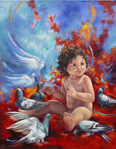 El niño representa la inocencia y la ternura, al lado de las palomas que representan la paz. La obra mide 24 X 30 Pulgadas.