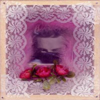 Caja de 17x17 Madera y metacrilato+carton Interior: tela, fotografía, plástico y plumas