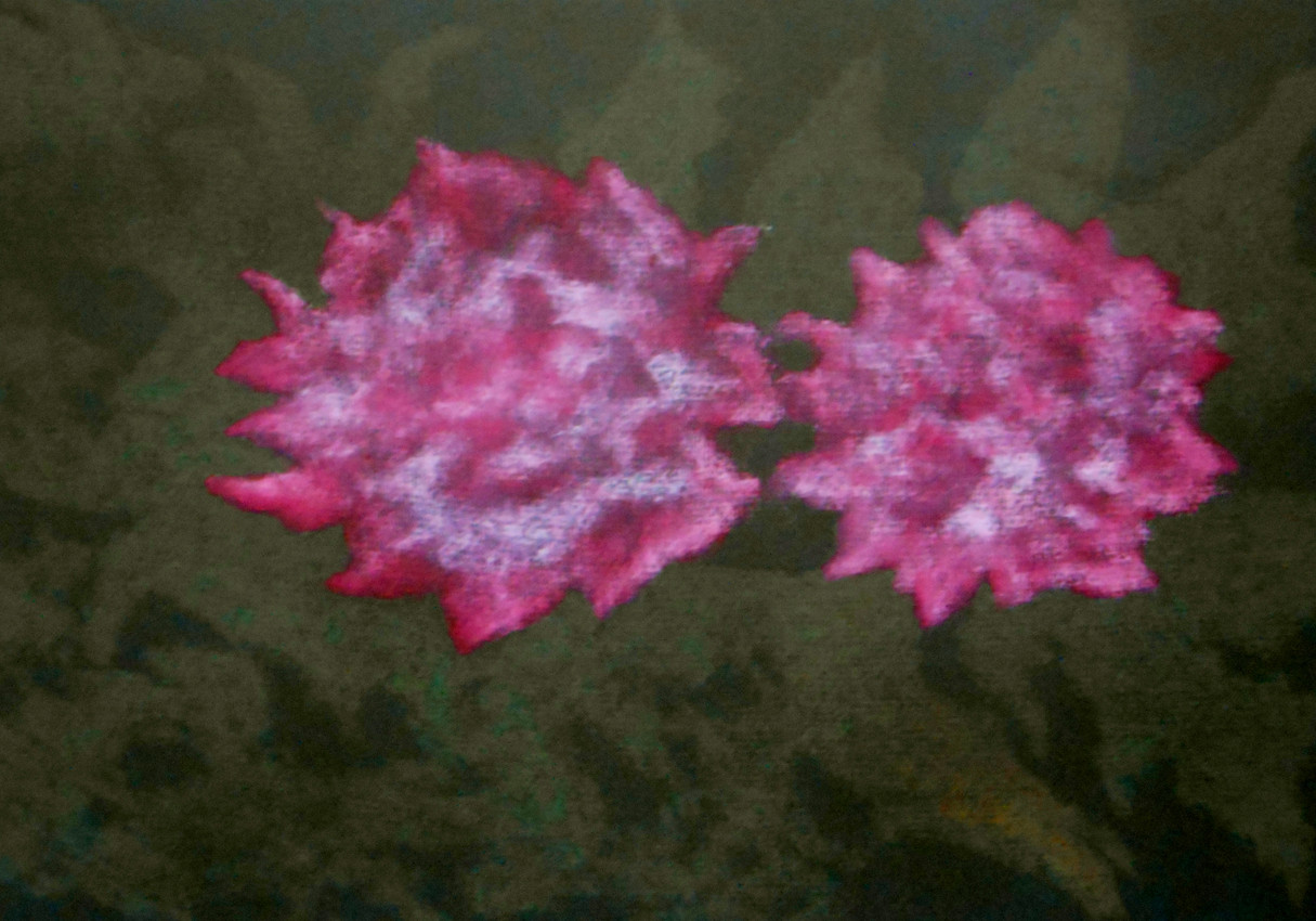 Este cuadro muestra dos flores en tonos vibrantes de rosa y fucsia, con matices blancos que aportan textura y profundidad. Ambas flores parecen estar suspendidas sobre un fondo oscuro verdoso, que resalta aún más la intensidad de sus colores. Las formas son irregulares, con bordes difusos que evocan movimiento, casi como si las flores se fundieran con la luz o se vieran a través de un sueño.
