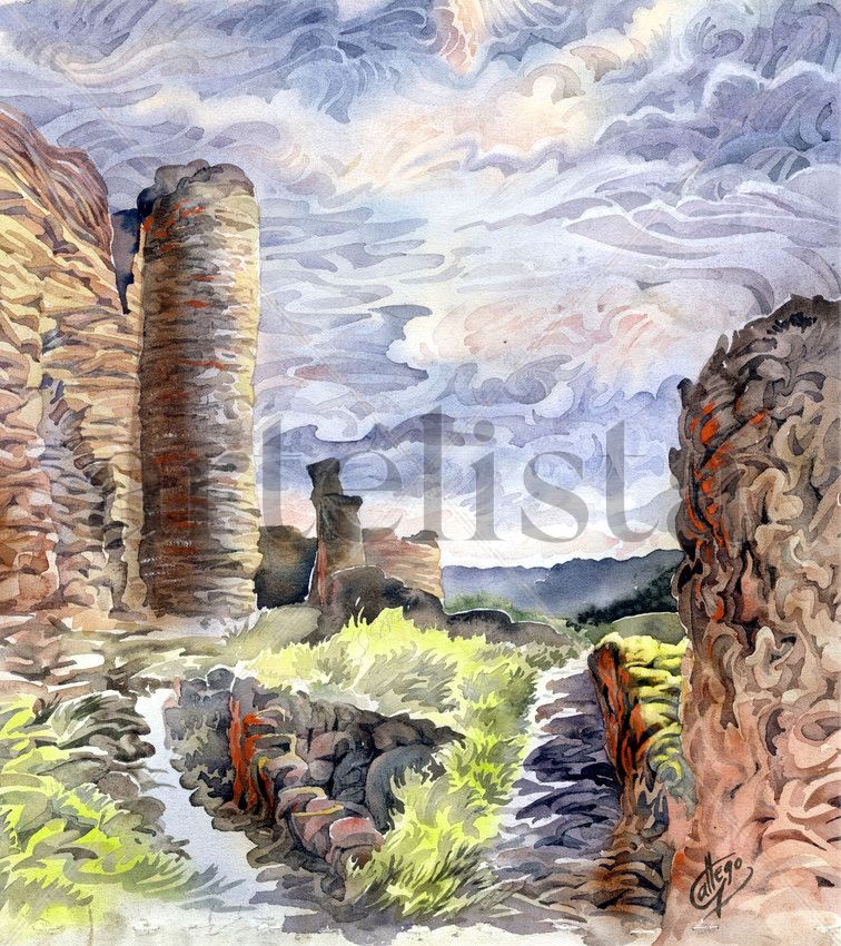 Acuarela de las ruinas del Castillo de frontera situado en Almonacid, provincia de Toledo antes del crepúsculo.