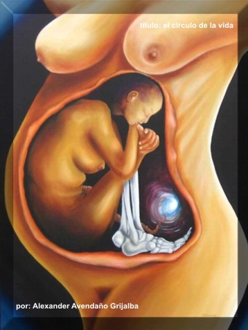 este es: sencillamente el principio y el fin, ligados desde el inicio de nuestra existencia a un cordón umbilical que proviene del que nos da la vida y que algunos lo llamamos Dios por medio de nuestra madre. El círculo continúa con el rostro de un recién nacido que en este caso al crecer se convierte en mujer, siguiendo el círculo, al pasar los años de la manera más natural termina en una muerte física; solamente huesos, los mismos que como piedras terminan enterrados en el olvido, en la nada. Pero, como muy seguramente no somos solo materia o huesos, por tanto, lo más bello de este círculo es volver al principio, al mismo túnel o la luz de la cual nacimos o mejor nos dio la vida o ¿será qué como en al parto nos dio a luz?
