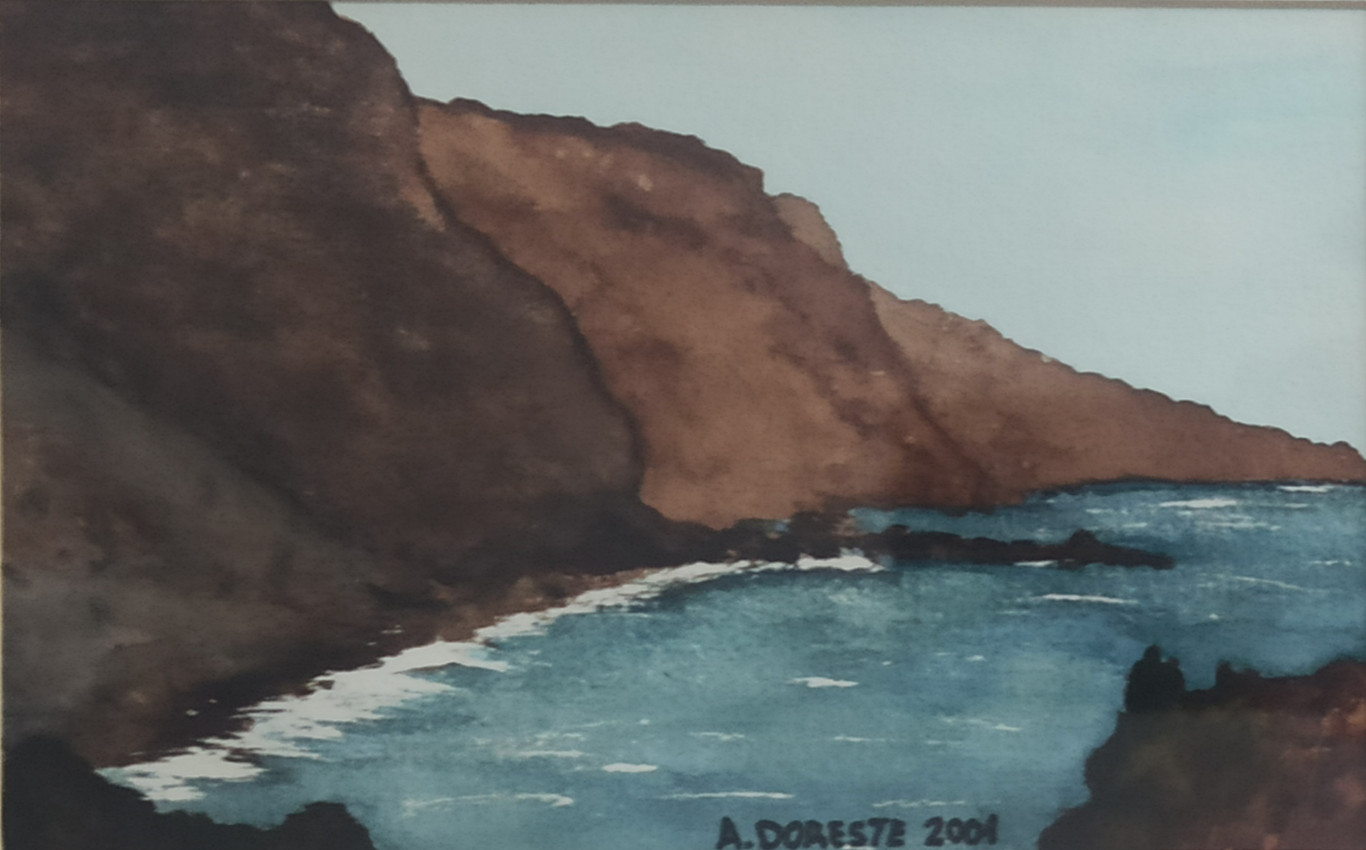 La pintura muestra un paisaje costero dominado por la fuerza de la naturaleza. En primer plano, las aguas del Atlántico rompen suavemente contra la orilla rocosa, dejando rastros de espuma blanca. Al fondo, se levantan imponentes acantilados de tonos marrones y rojizos, que contrastan con el azul sereno del mar y el cielo despejado. El trazo transmite la rudeza volcánica de la costa y la calma del horizonte abierto.