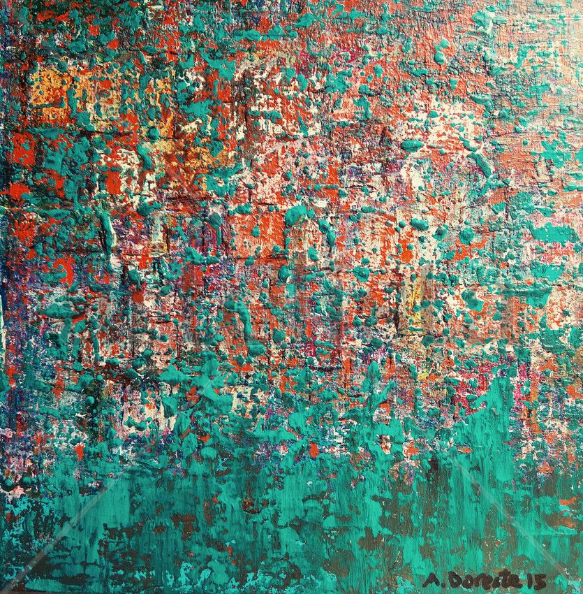 Este cuadro es una pieza abstracta cargada de textura y energía. La superficie está cubierta por capas gruesas de pintura aplicadas con fuerza, generando una sensación de relieve casi escultórico. Predominan los verdes turquesa y esmeralda, que se expanden como manchas orgánicas sobre un fondo cálido de naranjas, rojos y ocres, salpicados de toques violetas y blancos.