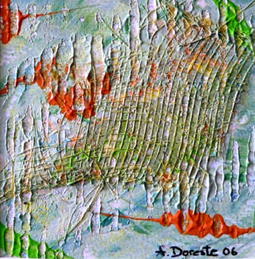 Este cuadro es una pieza de arte abstracto con fuerte carga de textura y relieve. La superficie es rugosa, casi escultórica, donde se aprecian surcos verticales y un entramado central a base de redes. Los colores predominantes son el blanco y tonos claros (azules, verdes y beige), sobre los que destacan pinceladas y manchas de rojo intenso y verde vivo, que aportan energía y contraste.