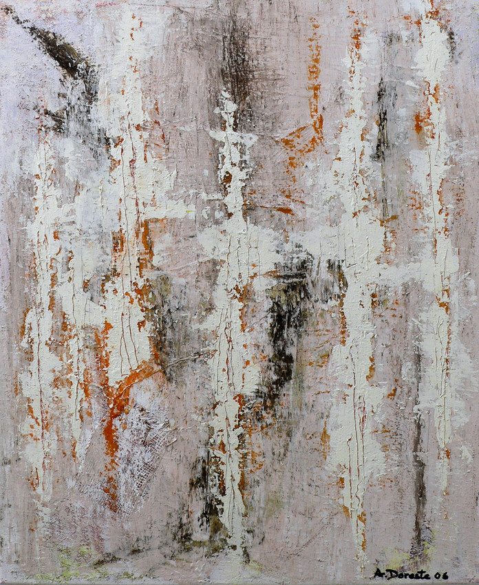 Este cuadro es una pintura abstracta de estilo expresionista. Presenta una base en tonos neutros y apagados, como beige y gris claro, sobre los cuales se extienden texturas rugosas con aplicaciones de blanco, negro y naranja óxido. Las pinceladas y manchas parecen surgir de manera orgánica, creando un efecto de erosión, desgaste o capas de historia acumuladas en la superficie.