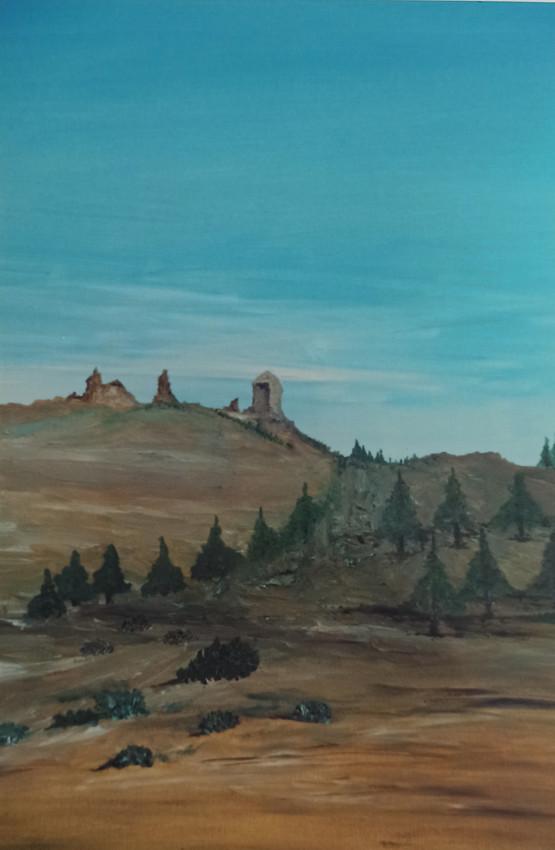 La pintura muestra el imponente Roque Nublo, uno de los símbolos naturales más representativos de Gran Canaria. En primer plano se extienden tonos terrosos y ocres que evocan la aridez de la meseta, salpicada por arbustos y pinares dispersos. Más arriba, las montañas se tiñen de verdes y marrones que contrastan con el cielo azul despejado.