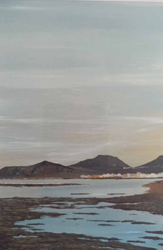 La pintura muestra un atardecer sereno en la playa de Las Canteras. El cielo, teñido de suaves tonos grises y dorados, se refleja en el mar tranquilo que ocupa la parte inferior de la escena. En el horizonte, destacan siluetas de montañas oscuras que contrastan con la luminosidad del cielo y el agua. A la derecha, una franja de edificaciones blancas y doradas insinúa la presencia de la ciudad, suavemente iluminada por los últimos rayos del día.