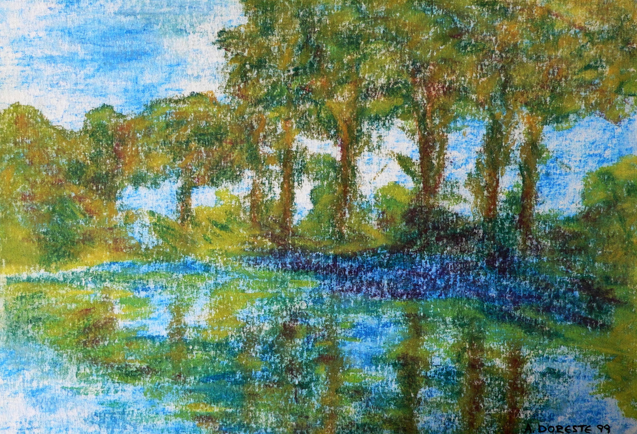 Este cuadro es un paisaje impresionista que muestra un entorno natural lleno de frescura y calma. En la obra se aprecian árboles altos, frondosos y verdes reflejándose en el agua tranquila de un río. La técnica utilizada, con pinceladas sueltas y colores vivos, transmite movimiento y vida a la escena. Los tonos predominantes son el verde, azul y toques de amarillo, que juntos crean una atmósfera luminosa y serena. El cielo claro con nubes dispersas complementa la armonía de la naturaleza.