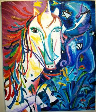 Esta obra ha sido la primera en lienzo de la artista y está dividida en dos: el día y la noche. El caballo trae el día y pisa el reflejo de la luna en el mar, salpicando gotas de agua con animalitos marinos.