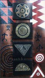 PINTURA AL OLEO SOBRE TABLA DE MADERA 71 X 123 ORIGINAL. COMPOSICIÓN DE SÍMBOLOS CANARIOS. 500 €