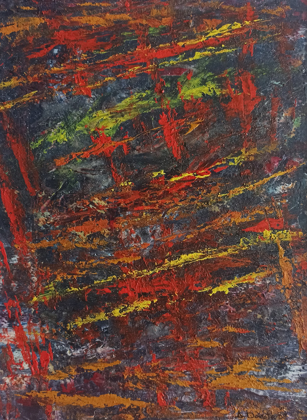 Este cuadro es una explosión de energía pura en forma abstracta. Los trazos son intensos, gruesos y desordenados, dominados por rojos encendidos que atraviesan el lienzo como relámpagos o cicatrices ardientes. Se entremezclan con tonos amarillos vibrantes y verdes eléctricos que parecen surgir entre un fondo oscuro, azulado y terroso, que aporta profundidad y dramatismo.