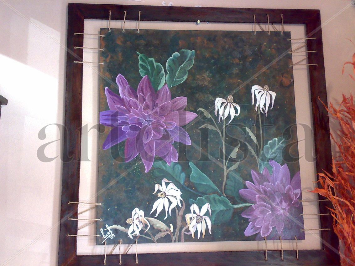 medida de la obra 68x73 oleo sobre tela entelada con marco rustico y union con hilos medida 90x90