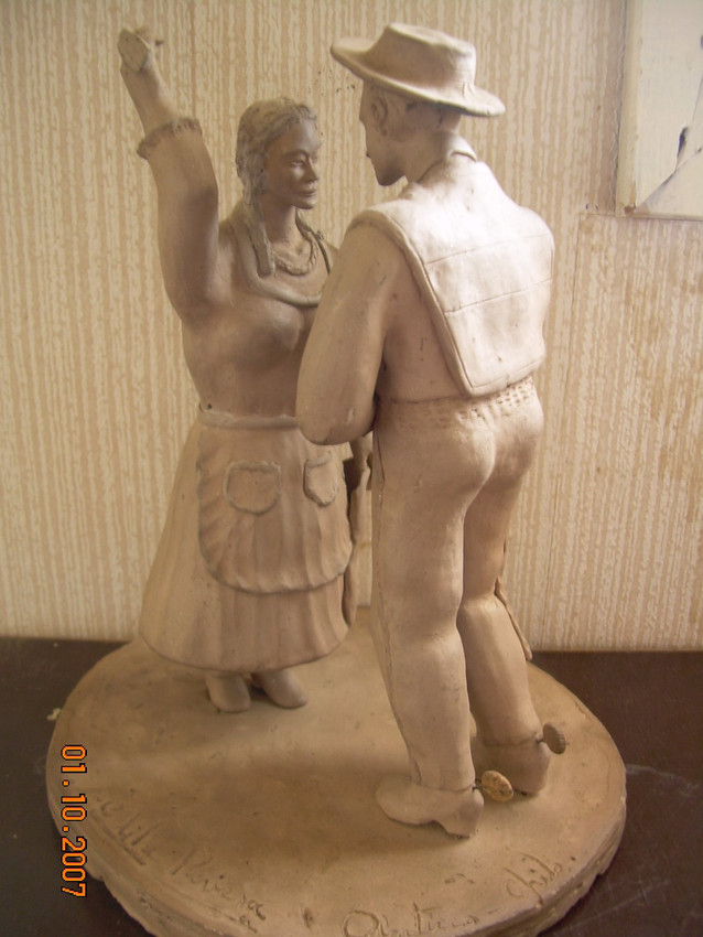 la cueca chilena es el baile tipico nacional de Chile,obra en arcilla cocida,confecccionada a mano popr la escultora Elita Rivera E. autodidacta de Antuco Chile,sus obras se han vedido a turistas,españóles,suizos ,alemanes ,y al gobierdo de