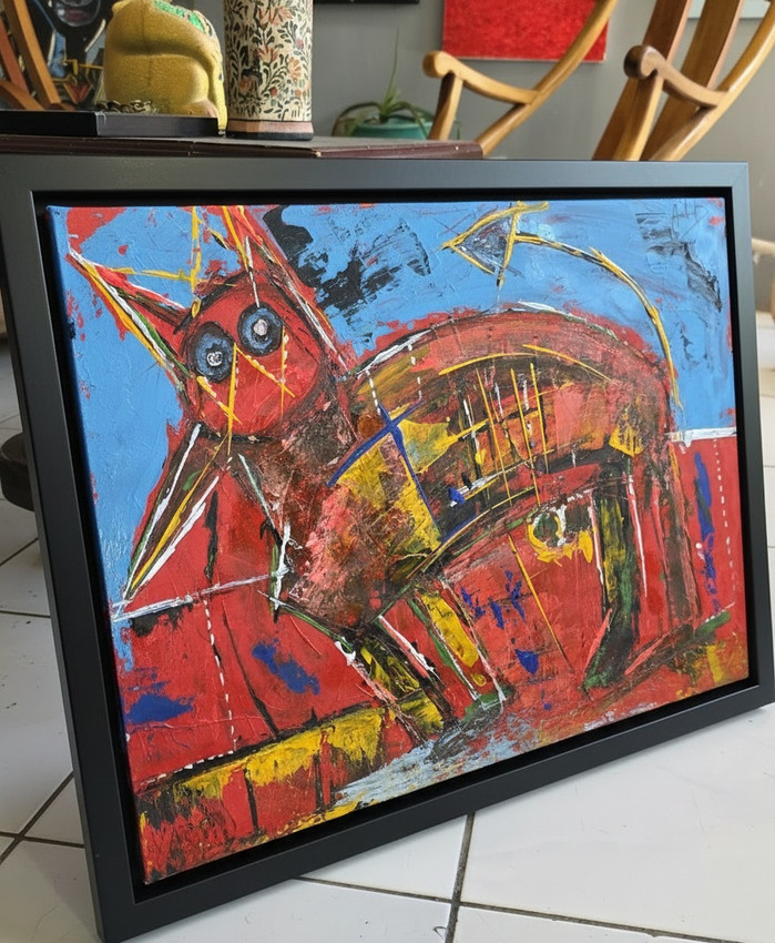 Una figura híbrida entre lo animal y lo espiritual emerge sobre un fondo de energía primaria. El rojo, símbolo de vitalidad y lucha interior, se entrelaza con el azul del pensamiento y el amarillo de la luz, creando un lenguaje visual de contrastes y emociones crudas. Las líneas marcadas y los trazos intuitivos revelan el impulso creador de Deshon, que transforma el caos en equilibrio y el instinto en arte.