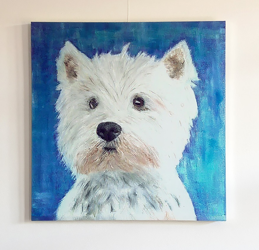 Retrato al óleo sobre lienzo de Lupe, una perrita de raza West Highland White Terrier (Westy). La obra se caracteriza por un estilo figurativo y realista, donde se resalta la ternura y personalidad del animal mediante una paleta suave, dominada por blancos cálidos y un fondo azul vibrante que aporta serenidad y profundidad.