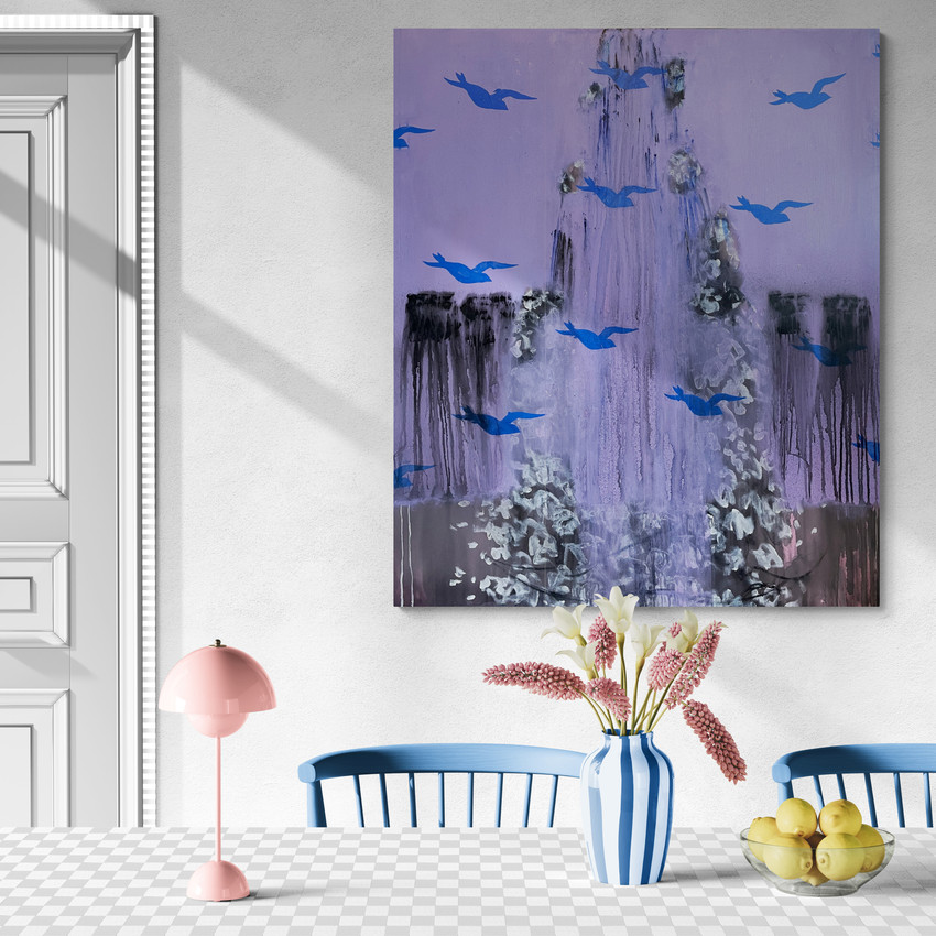 “A meditative vision of flight and transformation. Blue birds drift across a misted violet space — symbols of release, memory, and silent freedom. The painting captures the fragile moment between confinement and transcendence.”