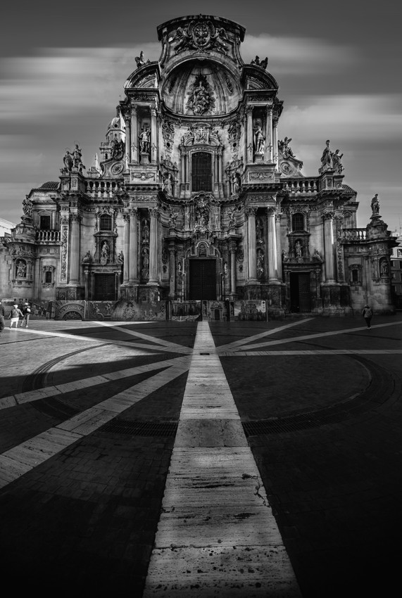 FACHADA CATEDRAL DE MURCIA ESPAÑA CON LAS LINEAS DEL SUELO QUE TE DIRIGEN A ELLA