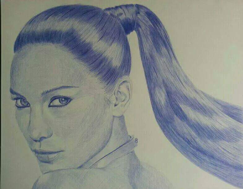 Este retrato realizado exclusivamente a bolígrafo azul demuestra un virtuosismo técnico excepcional. La obra destaca por la fluidez del cabello y una mirada penetrante, logradas mediante un entramado preciso de líneas. Una pieza de gran fuerza expresiva y detalle meticuloso, ideal para coleccionistas de dibujo contemporáneo.