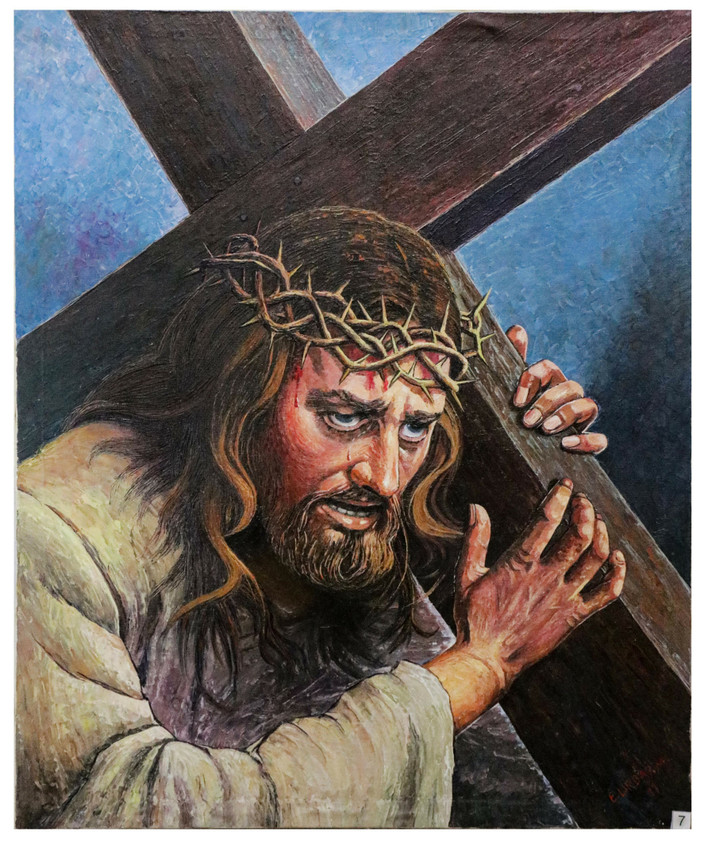 Descripción: Obra que representa a Cristo en la cruz, reflejando el sacrificio y la carga espiritual del momento. Este óleo de estilo realista busca mostrar la escena de forma objetiva, verídica y fiel, transmitiendo profundidad emocional, solemnidad y recogimiento a través del color, la luz y la textura.