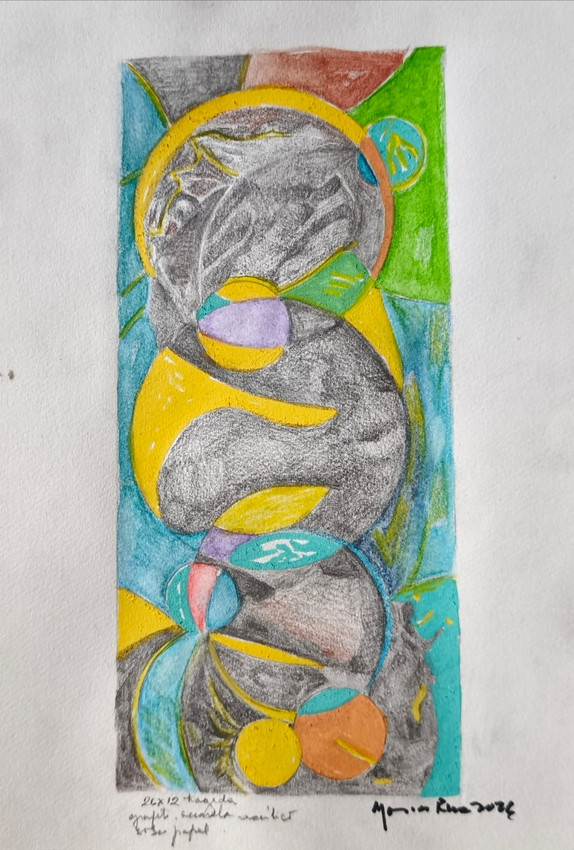 Composición abstracta vertical que combina grafito y color en un diálogo entre formas orgánicas y geometría simbólica. La fuerza del trazo en escala de grises contrasta con acentos vibrantes en amarillo, verde y turquesa, creando profundidad y equilibrio. Una obra contemporánea, elegante y expresiva, ideal para espacios modernos que buscan identidad y carácter.
