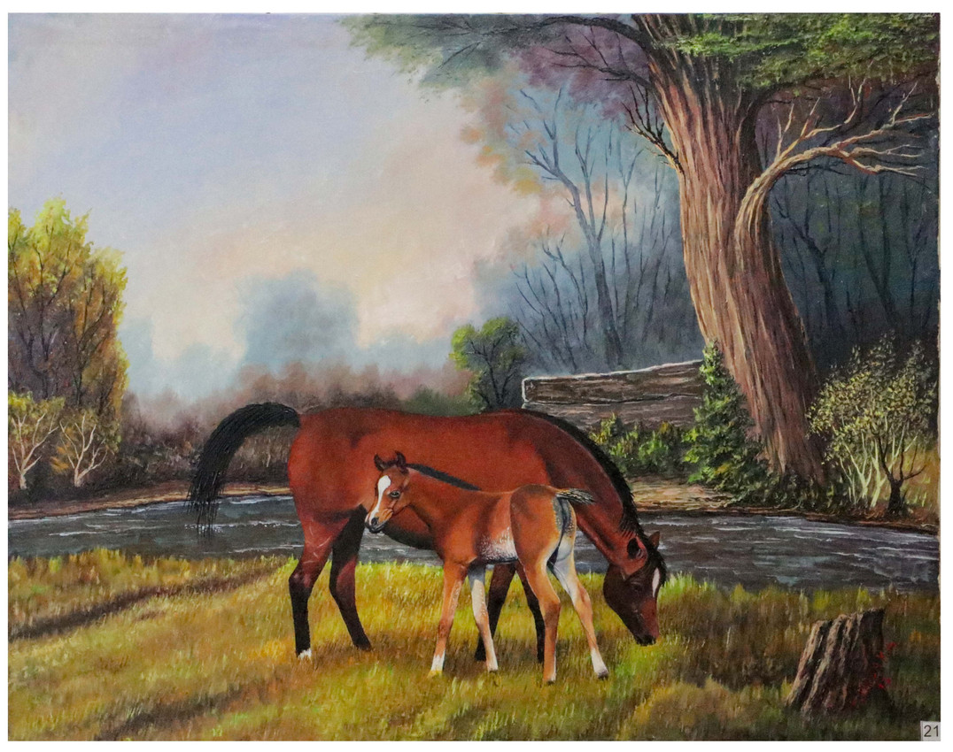 Descripción: Obra que representa un paisaje de bosque acompañado por una yegua junto a su cría, símbolo de vida, protección y armonía natural. La técnica de espátula y las capas de óleo aportan textura y profundidad a la escena.