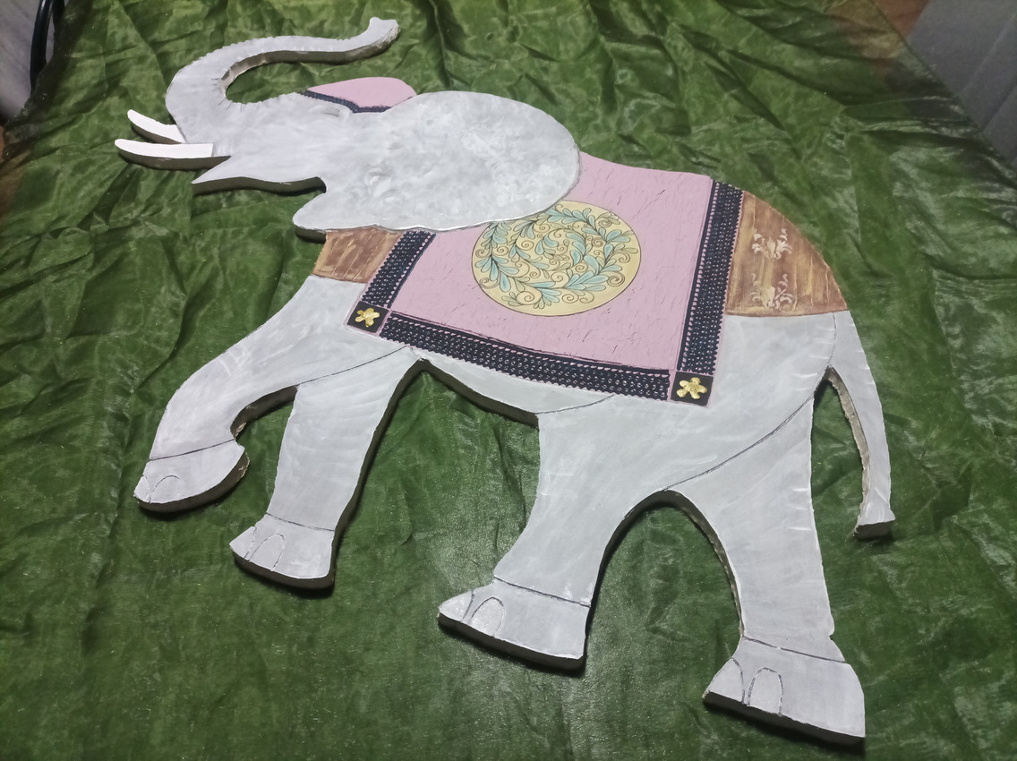 Elefante de 1,3 cm profundidad. Acabado con acrílicos, ceras, témperas y otros. Estilo Ceremonial con tallado y relieve.obra de María Gómez