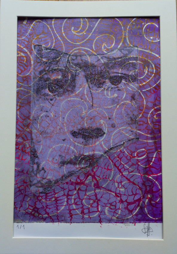 Monotipo (1/1). Técnica mixta sobre papel dibujo A4 con margen de passepartout incluido. El fondo en color violeta con varias texturas representa la unión del azul (tradicionalmente masculino) y el rosa (femenino), reflejando la equidad de género.