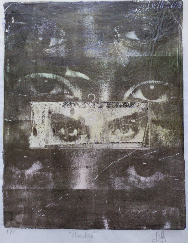 Monotipo original/pieza única (1/1) realizado con técnica mixta sobre papel xuan blanco. La ligereza del soporte hace que los pigmentos se marquen así como algunas huellas de rugosidad generadas en la impresión que da lugar a una estampa única con diversas texturas y capas de pigmento.