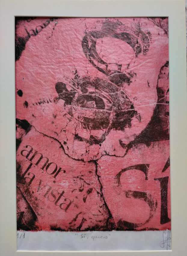 Monotipo (1/1). Técnica mixta sobre papel xuan. Transferencia de imagen con texto impreso y pigmento rosa metalizado.