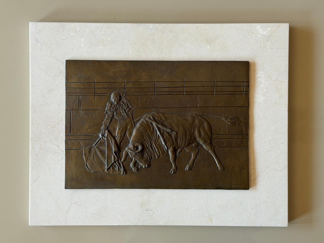 Bronce de Óscar Alvariño titulado "Derechazo". Medidas con el marco 42x33 y sin el marco 21x30. Se regala catálogo del autor donde aparece la obra.