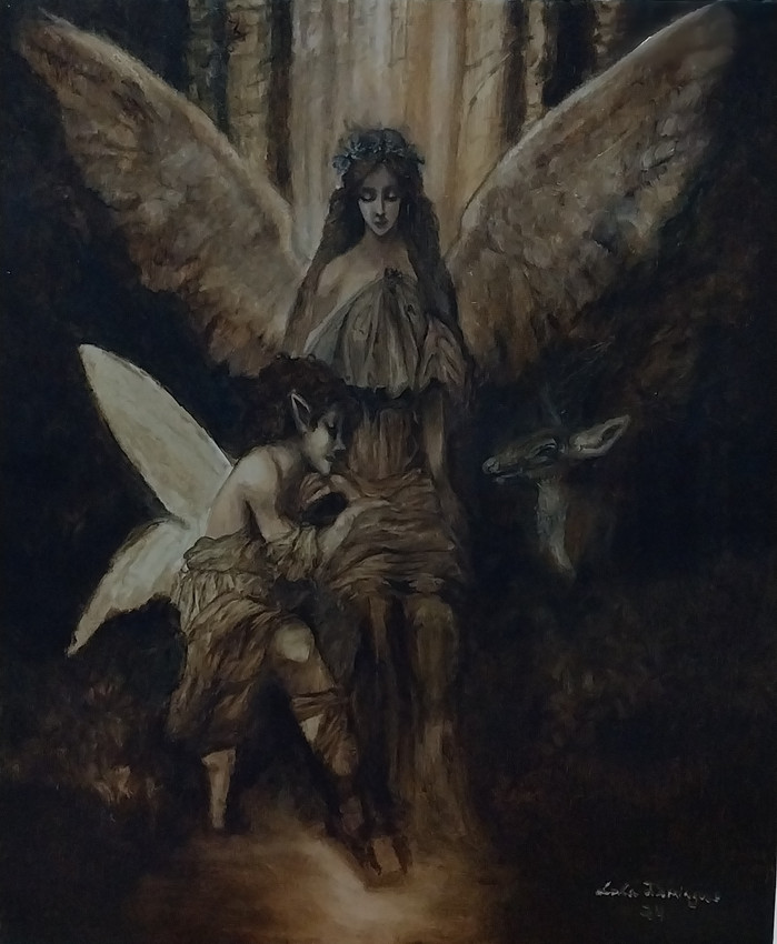 Angel and the Golden Fairy representa un instante de protección y ternura en el corazón del bosque. Un ángel luminoso acoge a un hada de alas doradas, mientras un ciervo emerge entre las sombras como símbolo de pureza y naturaleza sagrada. La atmósfera cálida y el claroscuro crean una escena íntima donde lo divino, lo feérico y lo terrenal se entrelazan en armonía. La obra transmite refugio, compasión y la belleza silenciosa de los mundos invisibles.