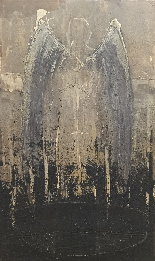 Obra realizada sobre madera con técnica mixta a base de resinas, barnices, árido y pigmento.