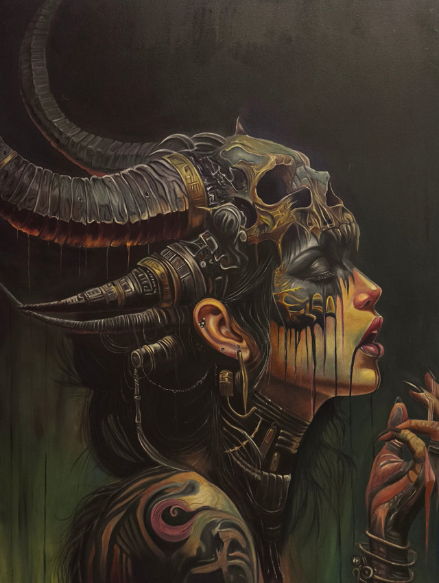 La figura emerge entre sombras como un ídolo contemporáneo, mitad diosa, mitad criatura forjada en los restos de un ritual olvidado. Sus cuernos metálicos y su corona de calavera no son simple adorno: son cicatrices convertidas en ornamento, vestigios de un pasado donde la muerte se transmuta en fuerza vital.