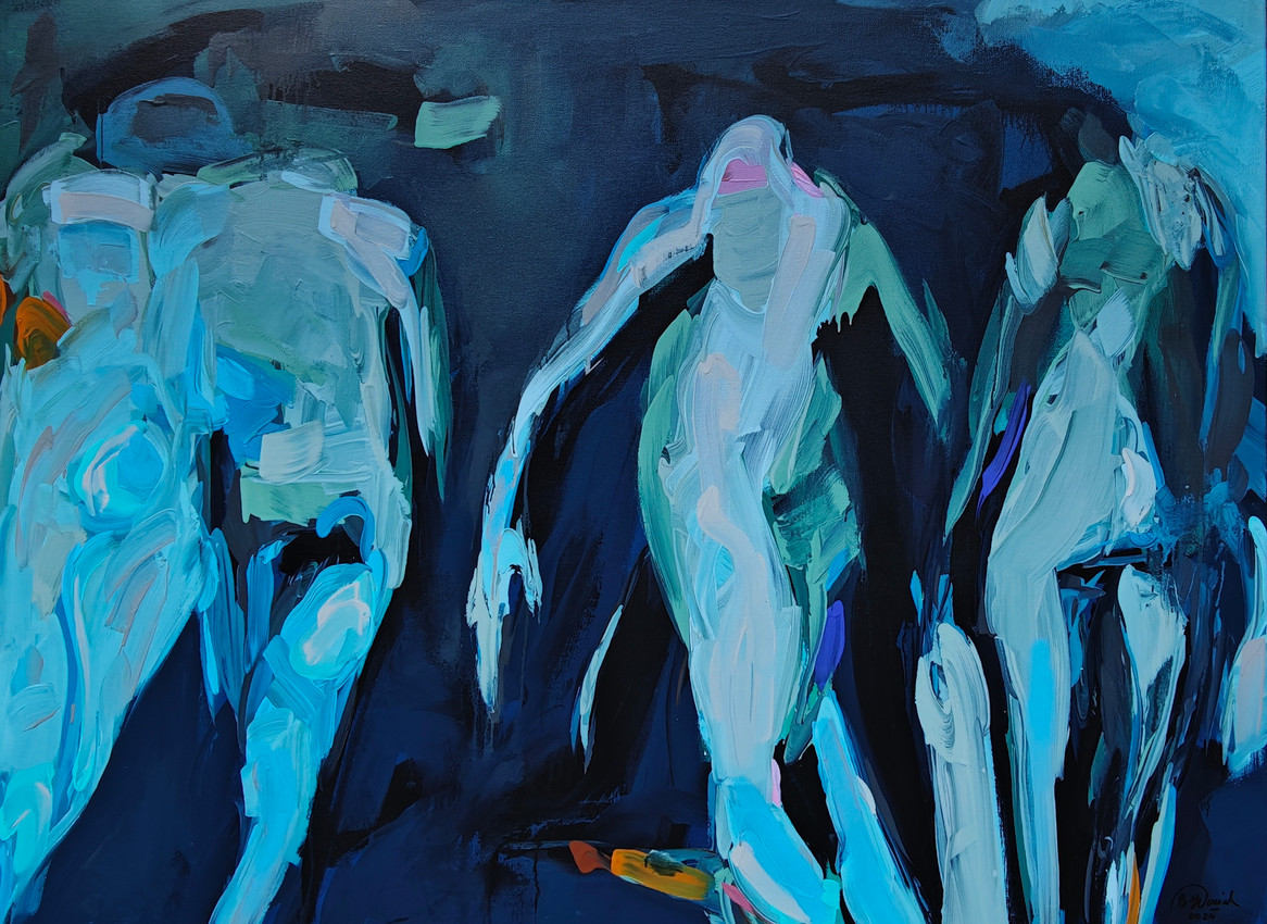 In this piece, I poured raw emotion onto the canvas, blending abstraction with the human form to evoke a sense of vulnerability and connection. The cool blues and fluid strokes capture a silent, haunting energy — like figures lost in time and space. Bringing this into your home, it will inspire reflection, stirring an atmosphere of quiet intensity and deep emotional resonance.