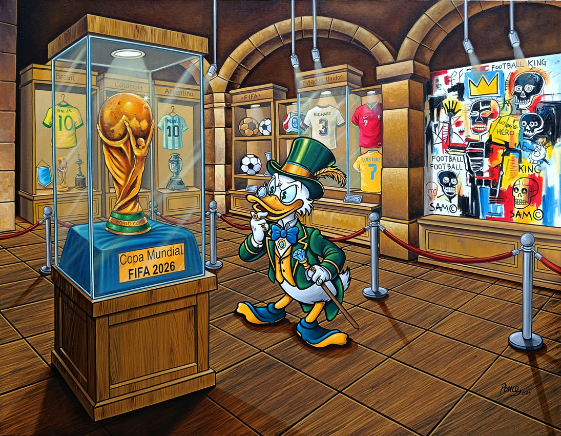 ...Mostrar que el fútbol ya no es solo un juego. No es casualidad que haya incluido a Tío Rico. Mi intención con él no fue mostrar a un fanático, sino al verdadero dueño de la Copa del Mundo. Para mí, es un símbolo de cómo el trofeo se ha convertido en un activo asegurado y de cómo la pasión ha sido absorbida por un negocio de licencias y propiedades.