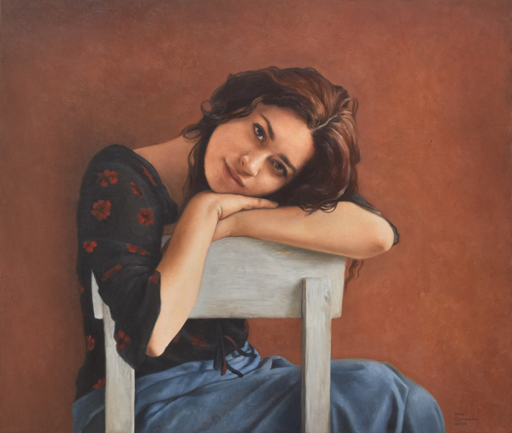 Una niña, sentada en una silla moderna, nos mira con ojos introspectivos. Adquirir un retrato contemporáneo de una niña captura la esencia de la juventud actual. Es una inversión cultural que apoya a artistas vivos y un activo cuyo valor puede crecer, reflejando la sensibilidad contemporánea.