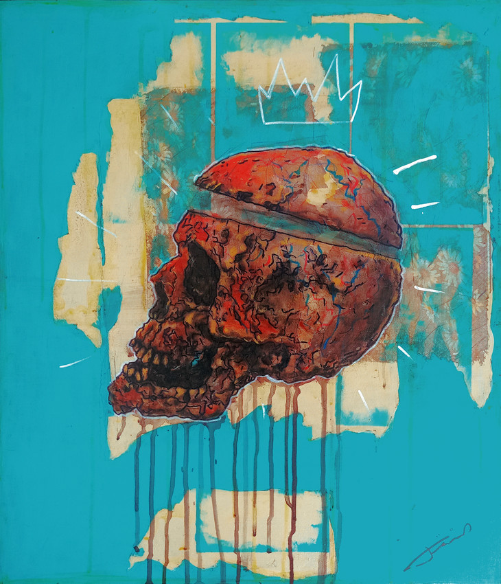 Esta impactante obra presenta una calavera adornada con una corona sobre un vibrante fondo turquesa. Los intrincados detalles de la calavera, combinados con una pincelada audaz, evocan una sensación de vida y decadencia. Las gotas de color aportan dinamismo, realzando la profundidad emocional de la pieza. Esta cautivadora pieza invita a la contemplación y sería un complemento irresistible para cualquier espacio.