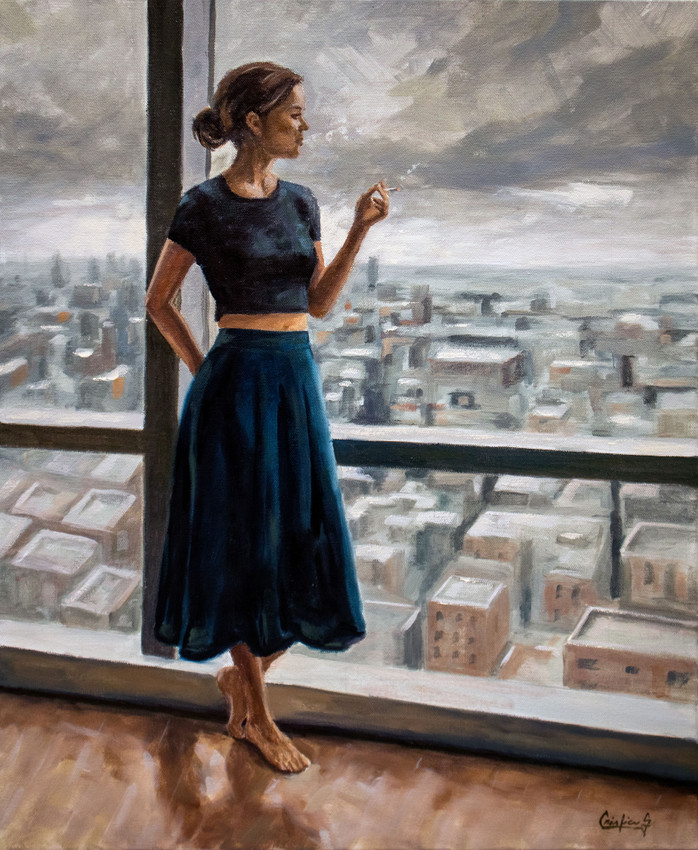 This painting, titled "From the Twentieth Floor," evokes a powerful sense of solitary contemplation. A lone figure, barefoot and grounded despite her elevated perspective, gazes outward at an expansive, indifferent cityscape. There's a profound stillness here, a moment of suspended awareness rather than despair, as the warm, familiar interior contrasts with the cool, distant urban sprawl.