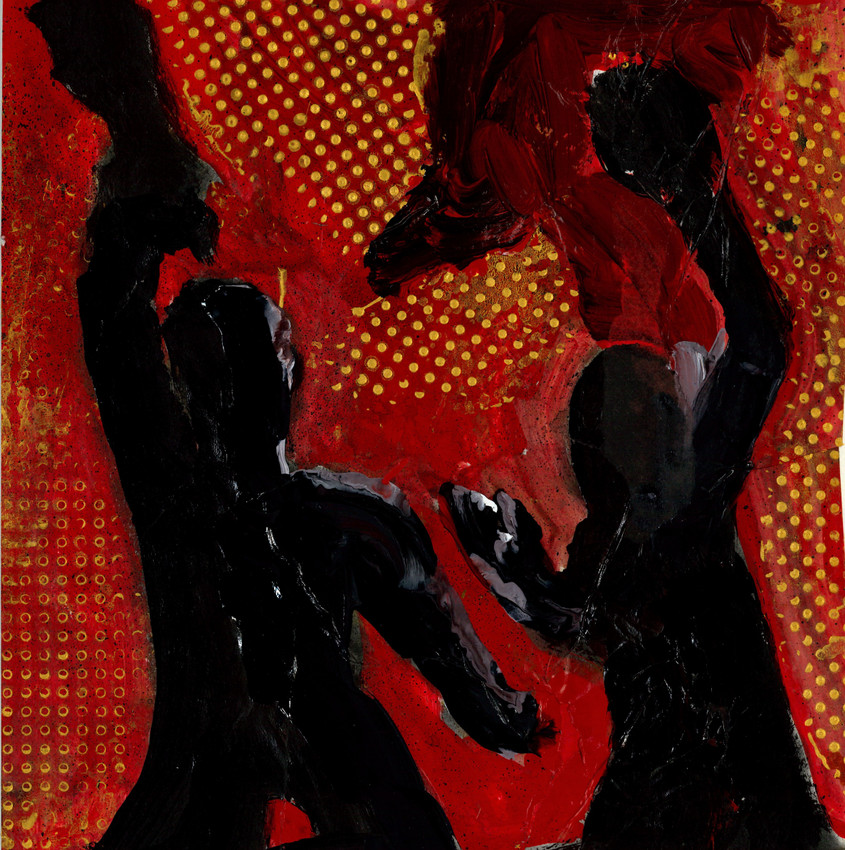 GARROTAZO 09 se resuelve con pintura y esmalte acrílicos en negros en primer plano a contra luz y rojos, negros y textura de puntos dorados en el fondo sobre cartulina.