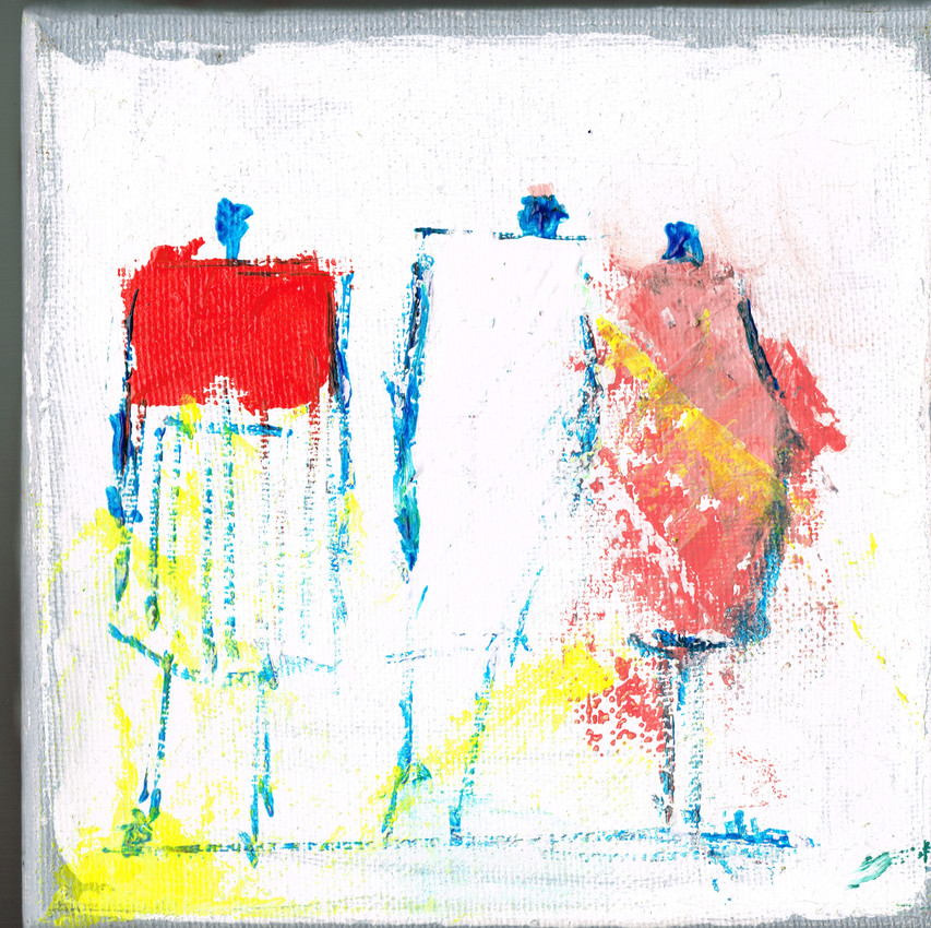 Tela de 15x15 centímetros. El fondo es óleo y las figuras acrílico. Un paseo, un momento, una reflexión.