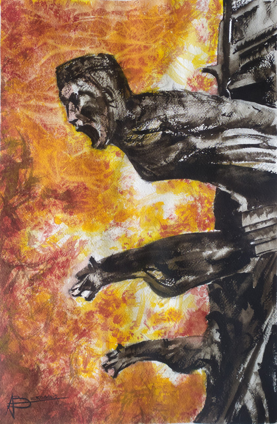 A Notre-Dame gargoyle pushes into the foreground, silhouetted against a burning sky. Color behaves like smoke and embers, and the stone seems to breathe unease. Architecture dissolves into shadow, while the carved guardian’s posture carries both urgency and silence—an instant of panic held in a heated, vibrating atmosphere.