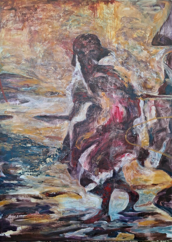 La imagen propone una escena abierta, ambigua, en la que lo monstruoso no actúa como amenaza sino como espejo de la condición humana, invitando al espectador a una experiencia pictórica basada en la intuición, la memoria y la resonancia simbólica.