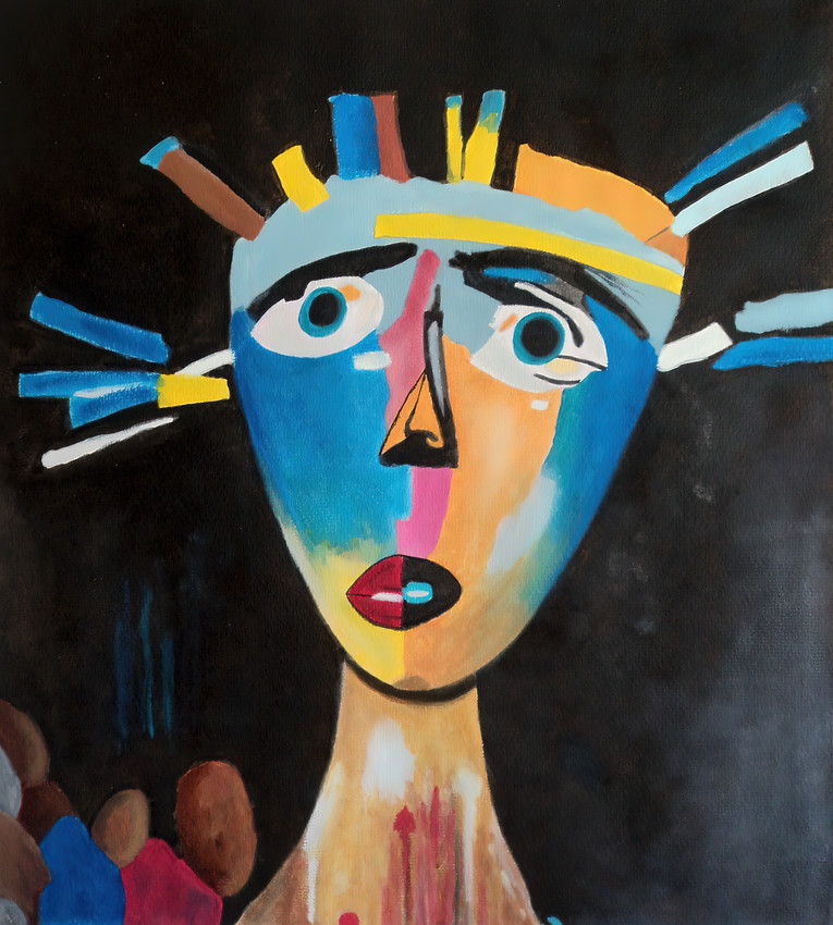En este retrato, Antonio Abril crea una figura simbólica de gran fuerza visual. El rostro se compone de franjas de color vibrante —azules, rosas, amarillos y naranjas— que se funden con un fondo oscuro, resaltando su expresividad. Los ojos abiertos y la boca enmarcada generan un aire de sorpresa o misterio, mientras que los elementos geométricos que rodean la cabeza recuerdan a ornamentos tribales o rituales. Una obra cargada de energía, que fusiona lo primitivo y lo contemporáneo en un lenguaje pictórico único.