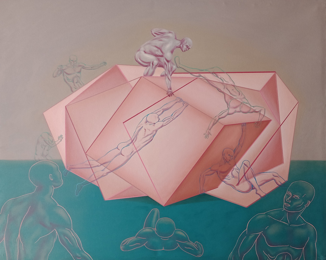 Compleja interacción de figuras humanas estilizadas y formas geométricas translúcidas. En el centro, un conjunto de cubos rosados y transparentes encierra cuerpos en movimiento, algunos cayendo, otros extendiéndose. Una figura de tono rosado más sólido se equilibra sobre estas estructuras, mientras que en la parte inferior, siluetas azules delineadas observan desde un plano vibrante. La obra explora la dinámica del cuerpo en un espacio fragmentado, utilizando una paleta de grises suaves, azules intensos y rosas etéreos para crear una composición de tensión y fluidez.