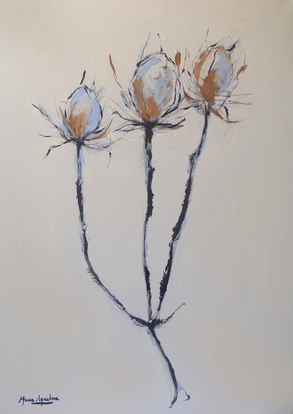 Sobre un plano limpio y sereno, emergen los cardos en flor. Cada trazo guarda la esencia misma del campo, esa memoria intacta que persiste y florece. Es botánica de identidad, una firma fiel del paisaje que me habita. Hay algo pleno en este dibujo: el gesto es preciso, la forma es presencia, y lo silvestre se vuelve poético.