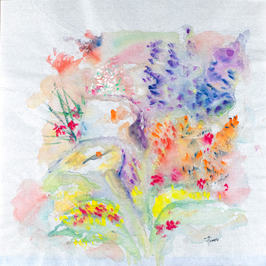 En esta serie de obras, donde hayt óleos, acrílicos y acuarelas, busco representar a través de las flores el caos aparente de la naturaleza en su estado puro. Acuarela sobre papel de arroz