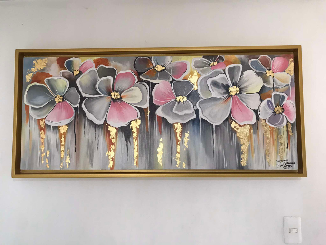 Esta obra combina la delicadeza floral con la fuerza del arte contemporáneo . En un formato rectangular, grandes flores de pétalos suaves en tonos gris, rosa y beige se despliegan sobre un fondo degradado de grises, ocres y dorados. Los toques de pan de oro aportan brillo, elegancia y textura, creando un contraste armonioso con los colores neutros y las pinceladas fluidas que descienden como gotas de pintura.
